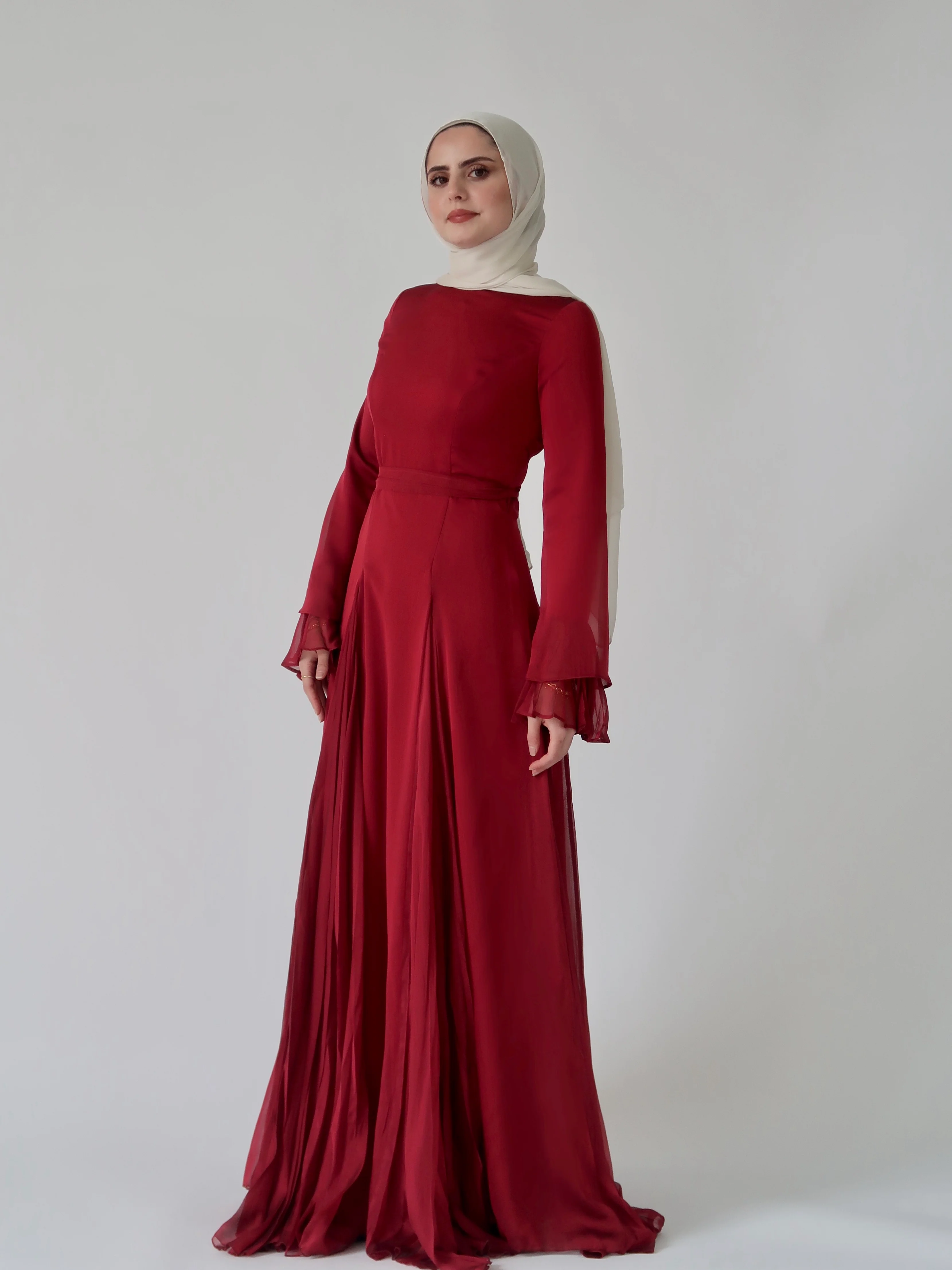 It runs fitted and we recommend sizing up. There are laces attached to the back to tighten as desired, or create a criss-cross pattern in the front with the belt. There is a concealed back zipper for entry. Gown is fully lined and made of a shimmering chiffon. We recommend pairing with our Oat Cream scarf.
