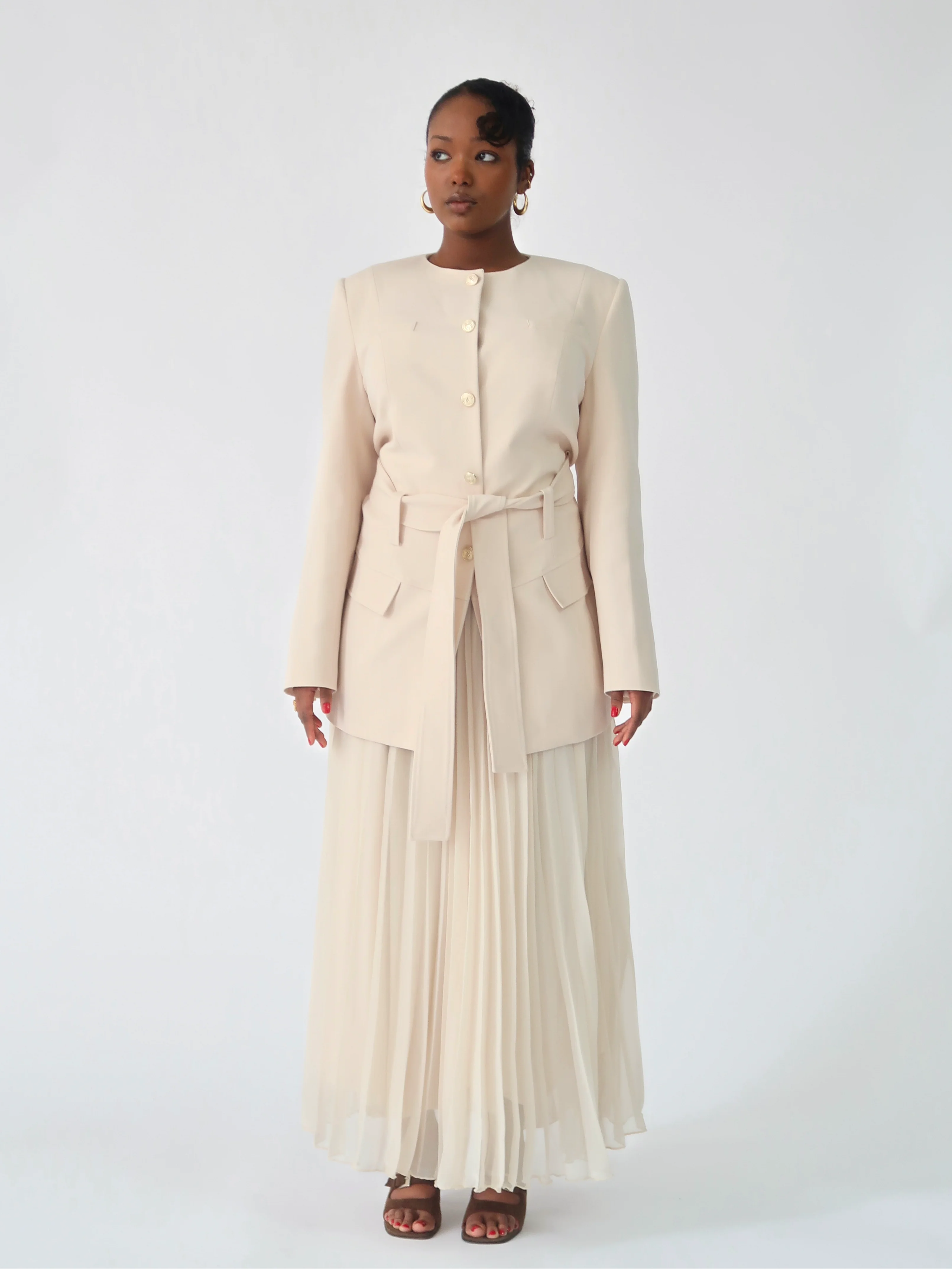 This versatile wardrobe piece will be your go-to item at your next formal event. Designed with shimmering fabric, meters of pleating, and lining all around, the pleated chiffon skirt is an effortless closet staple to pair with your own tops, or our blazer tunics. The top pictured here is not included— only the skirt.