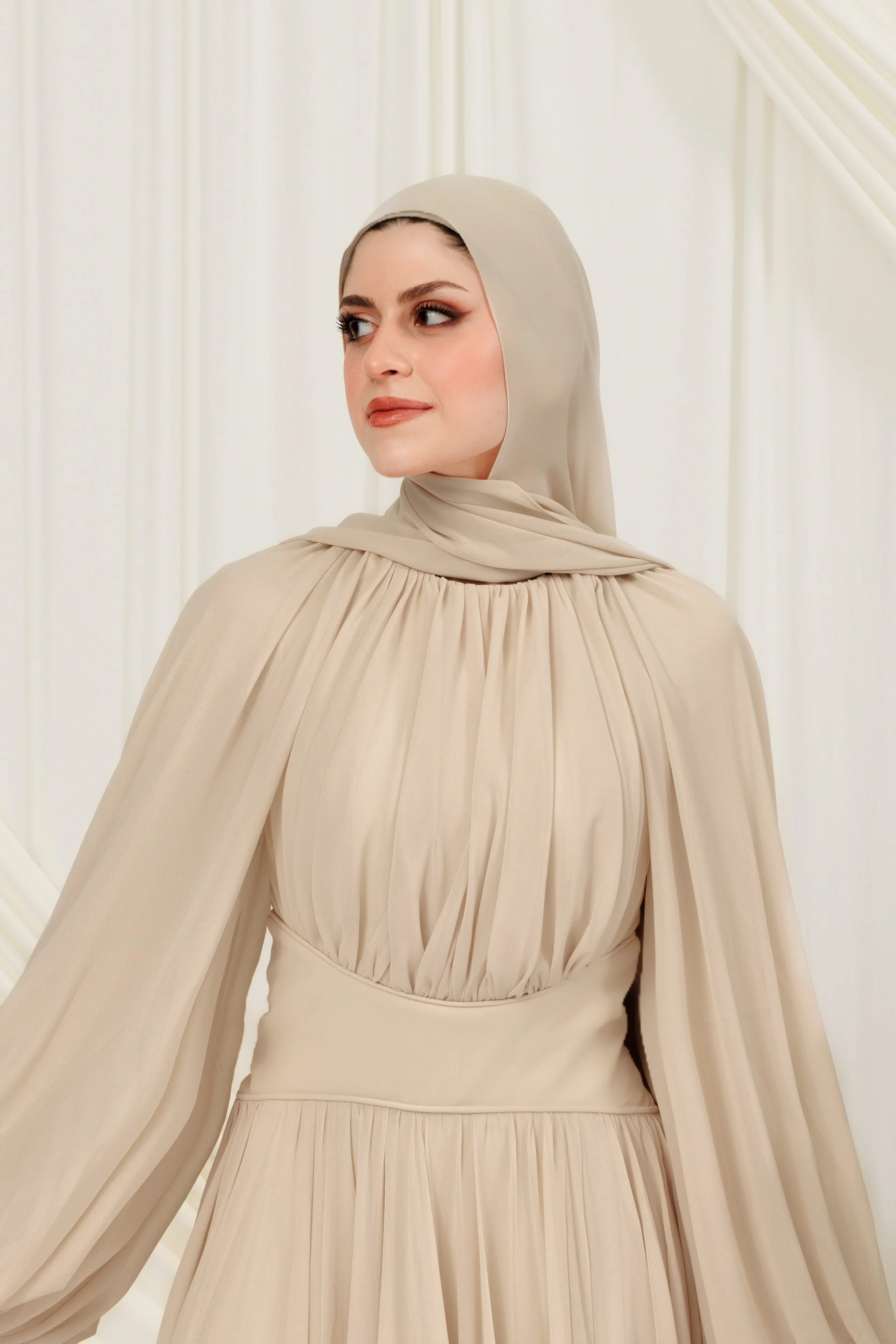 The gown is completed with a concealed zipper entry on the back and is fully lined. Sizing runs true to size with an intended hourglass fit. We recommend pairing with our Sand Matte Chiffon Scarf.