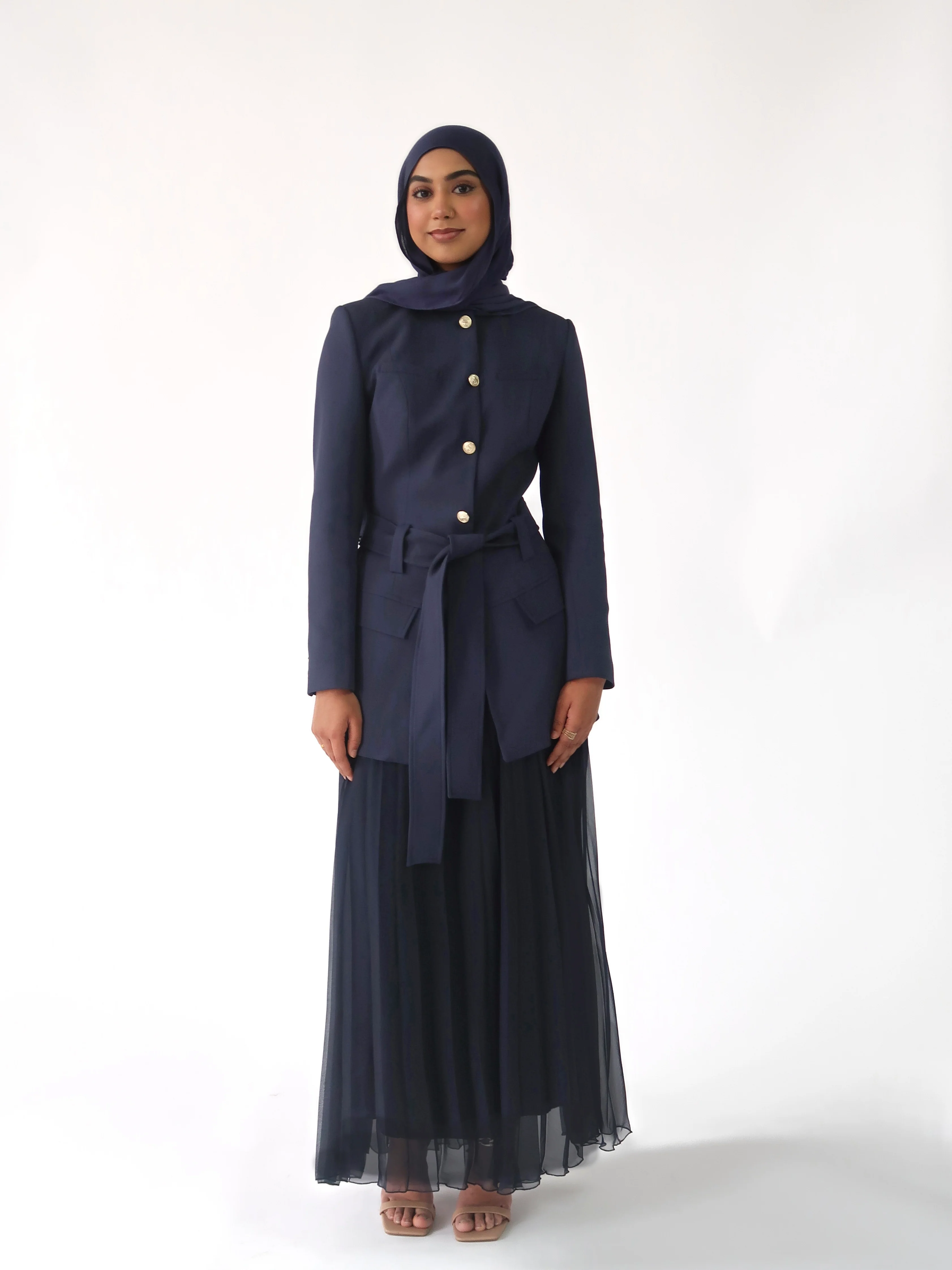 Introducing the SE Belted Jacket— made with custom hardware featuring our signature logo, this one of a kind piece is bound to have heads turning and become a staple in your closet. The fabric is thick and durable and lined with luxurious satin, while also suitable for fall, winter or spring. The jacket is long enough to cover the back, making it a modest choice with our matching skirt or your own wide pants. The jacket closes with clasps inside for easy on and off wear (and metal buttons are just for display). The pockets are nonfunctional and belt is removable and adjustable to your tightness preference.